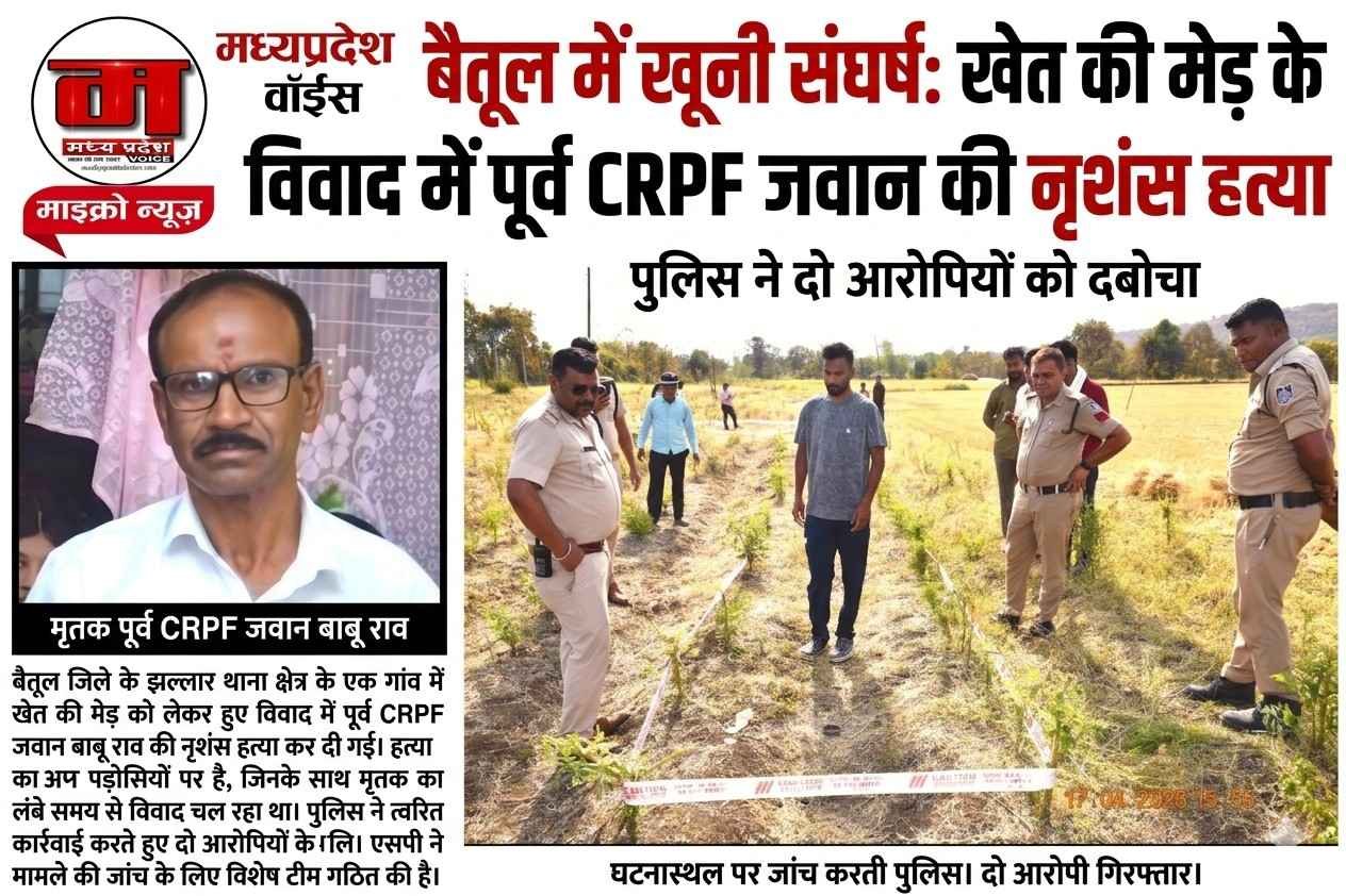 बैतूल। जिले के गंज थाना क्षेत्र में एक पुरानी रंजिश ने खूनी रूप ले लिया। बरसाली क्षेत्र में खेत की मेड़ को लेकर हुए विवाद में एक पूर्व सीआरपीएफ (CRPF) जवान बाबूराव सातनकर की बेरहमी से हत्या कर दी गई। आरोपियों ने डंडों और नोजल पाइप से जवान पर इतना जानलेवा हमला किया कि इलाज के दौरान जिला अस्पताल में उन्होंने दम तोड़ दिया। पुलिस ने इस मामले में तत्परता दिखाते हुए दो मुख्य आरोपियों को गिरफ्तार कर लिया है, जबकि एक अन्य की तलाश जारी है।