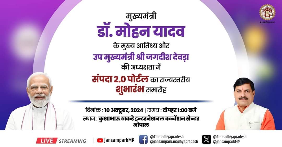 भोपाल। मुख्यमंत्री डॉ. मोहन यादव के मुख्य आतिथ्य और उप मुख्यमंत्री श्री जगदीश देवड़ा की अध्यक्षता में 10 अक्टूबर, 2024 को दोपहर 1:00 बजे कुशाभाऊ ठाकरे इंटरनेशनल कन्वेंशन सेंटर में संपदा 2.0 पोर्टल का राज्यस्तरीय शुभारंभ समारोह आयोजित किया जाएगा।