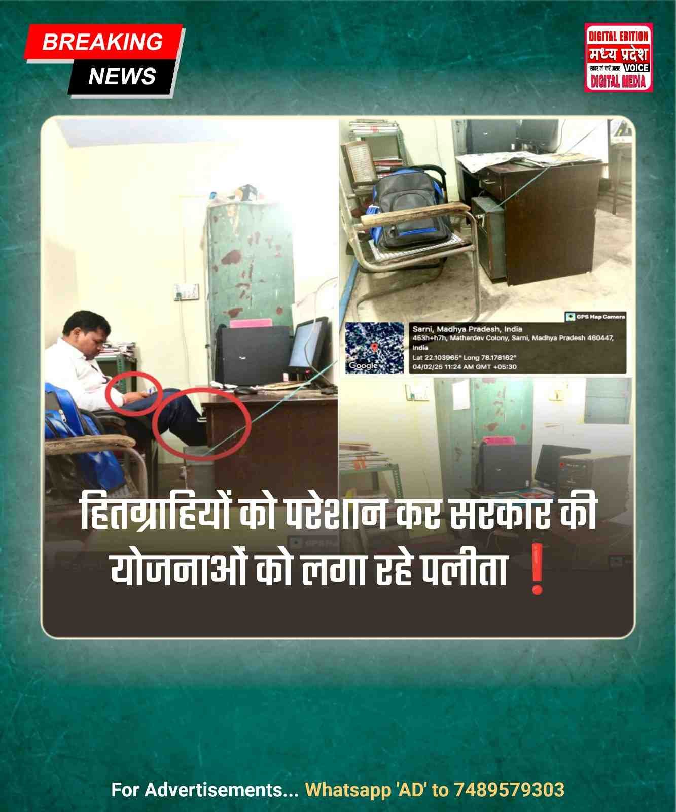 बैतूल/सारनी। महिला बाल विकास परियोजना सारनी में पदस्थ सहायक ग्रेड 3 संजय उईके द्वारा सार्थक ऐप पर हाजिरी लगा कर कार्यस्थल से गायब होकर जिला कार्यक्रम एवं कलेक्टर को गुमराह करने का मामला प्रकाश में आया है। जानकारी के अनुसार महिला एवं बाल विकास परियोजना सारणी में पदस्थ सहायक ग्रेड 3 संजय उईके द्वारा पिछले कई दिनों से रोजाना 10 बजे सार्थक ऐप पर हाजिरी लगाकर तुरंत ही अपना कार्यस्थल छोड़ देते हैं। इतना ही नहीं जिला प्रशासनिक अधिकारी को गुमराह करने के लिए बाकायदा संजय उईके अपना मोबाइल अपने कार्य स्थल पर बैग में रखकर या कर्मचारी मित्र को देकर ऑफिस से चले जाते हैं। ताकि सार्थक ऐप के जरिए बैतूल में बैठे अधिकारी लोकेशन के आधार पर कर्मचारी को देखें तो वहां अपने कार्य स्थल पर उपस्थित दिखे। इस तरह विभागीय अधिकारियों की आंख में धूल झोंक कर संजय उईके मनमानी कर ड्यूटी के समय अपने बाहरी काम कर आराम फरमाते हैं। इतना ही नहीं इनके द्वारा कार्यस्थल पर कंप्यूटर बंद करके फिल्म प्रोड्यूसर से लंबी-लंबी बातें की जाती हैं, अगर इस बीच कोई हितग्राही योजना की जानकारी लेने आ गया तो समझो उसकी गनीमत आ जाती है, यह महाशय उनके साथ दुर्व्यवहार करने से भी बाज नहीं आते, उन्हें कंप्यूटर खराब है कहकर चलता कर दिया जाता हैं। लंबे समय से इनके द्वारा सैकड़ो हितग्राहियों को परेशान करके सरकारी योजनाओं को पलीता लगाया जा रहा है।