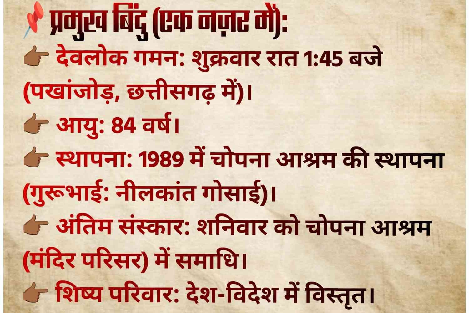 सारणी/चोपना। क्षेत्र के सुप्रसिद्ध धार्मिक स्थल नर नारायण सेवा आश्रम, चोपना के पूज्य संत और संस्थापक गुरुदेव सुखानंद गोसाई ब्रह्मचारी जी (जिन्हें भक्त प्रेम से ‘बाबुल गोसाई’ के नाम से जानते थे) ने 84 वर्ष की आयु में अपनी नश्वर देह का त्याग कर दिया है। उनके ब्रह्मलीन होने के समाचार से चोपना क्षेत्र सहित देश-विदेश में फैले उनके हजारों शिष्यों और अनुयायियों में शोक की लहर दौड़ गई है।