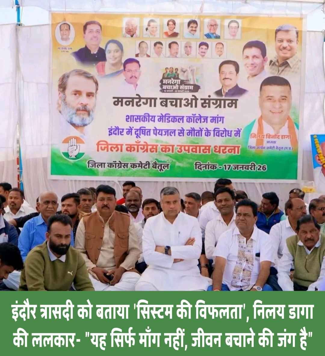 बैतूल। जिला कांग्रेस कमेटी बैतूल ने जिले की बदहाल स्वास्थ्य व्यवस्थाओं को पटरी पर लाने, शासकीय मेडिकल कॉलेज की स्थापना और ‘मनरेगा बचाओ संग्राम’ के तहत एक व्यापक आंदोलन का आगाज किया है। इंदौर में दूषित पेयजल से हुई मौतों को “सरकारी तंत्र की विफलता” बताते हुए कांग्रेस ने बैतूल में आम जनता के ‘जीवन के अधिकार’ (Right to Life) की रक्षा के लिए अनिश्चितकालीन उपवास और धरने की शुरुआत कर दी है। यह धरना सिर्फ एक राजनीतिक विरोध नहीं, बल्कि जिले की जनता की सुरक्षा और उनके हकों की आवाज बनकर उभरा है।
